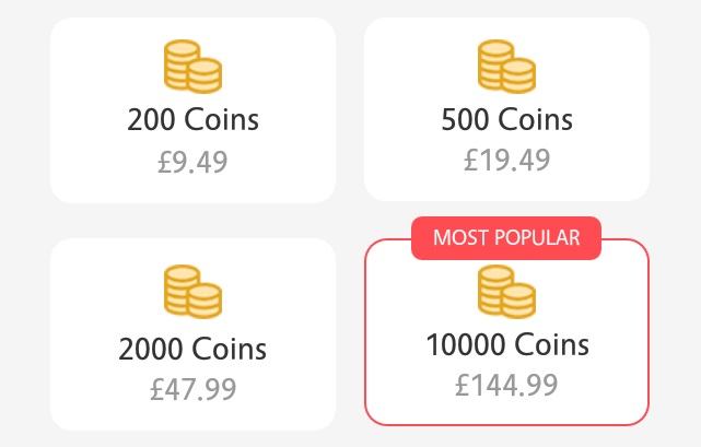 Almost every action on the App to interact with other ‘members’ on the site requires you to purchase a ‘coin package’ ranging in price from £9.49 (200 coins) to £144.99 (10,000 coins), from sending messages to reading secret ‘Whispers’ which are received almost instantly after signing up, even when your profile is basically empty.